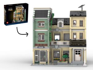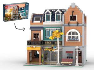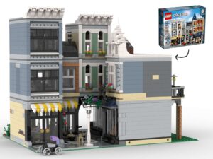 Dit gebouw is een ‘omgekeerde hoek’. Modulaire gebouwen van Lego hebben allemaal hetzelfde formaat: ze zijn gebouwd op een baseplate van 32×32 studs. Voor het gebouw is een stoep van 6-8 studs diep. Er zijn ‘rechte’ gebouwen en ‘hoekgebouwen’, die de hoek omgaan. Dit gebouw gaat ook de hoek om, maar naar je toe in plaats van van je af.