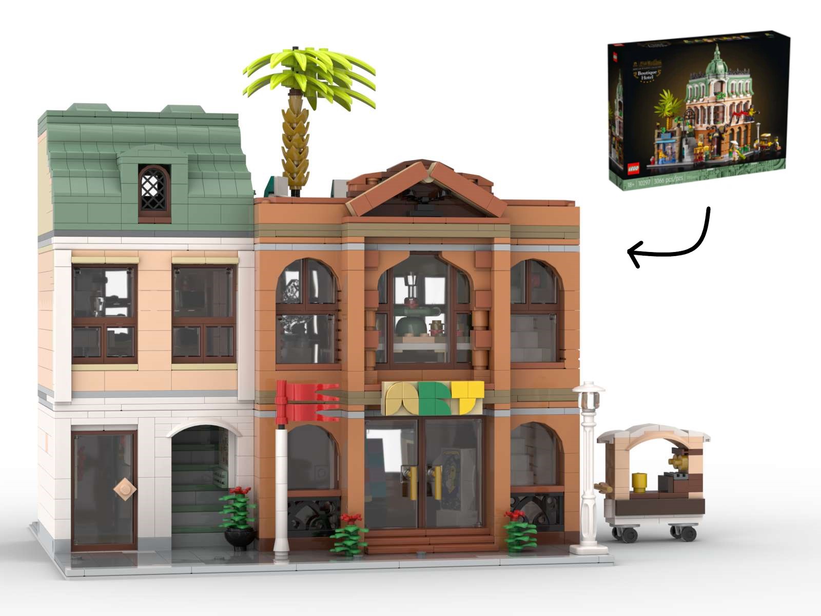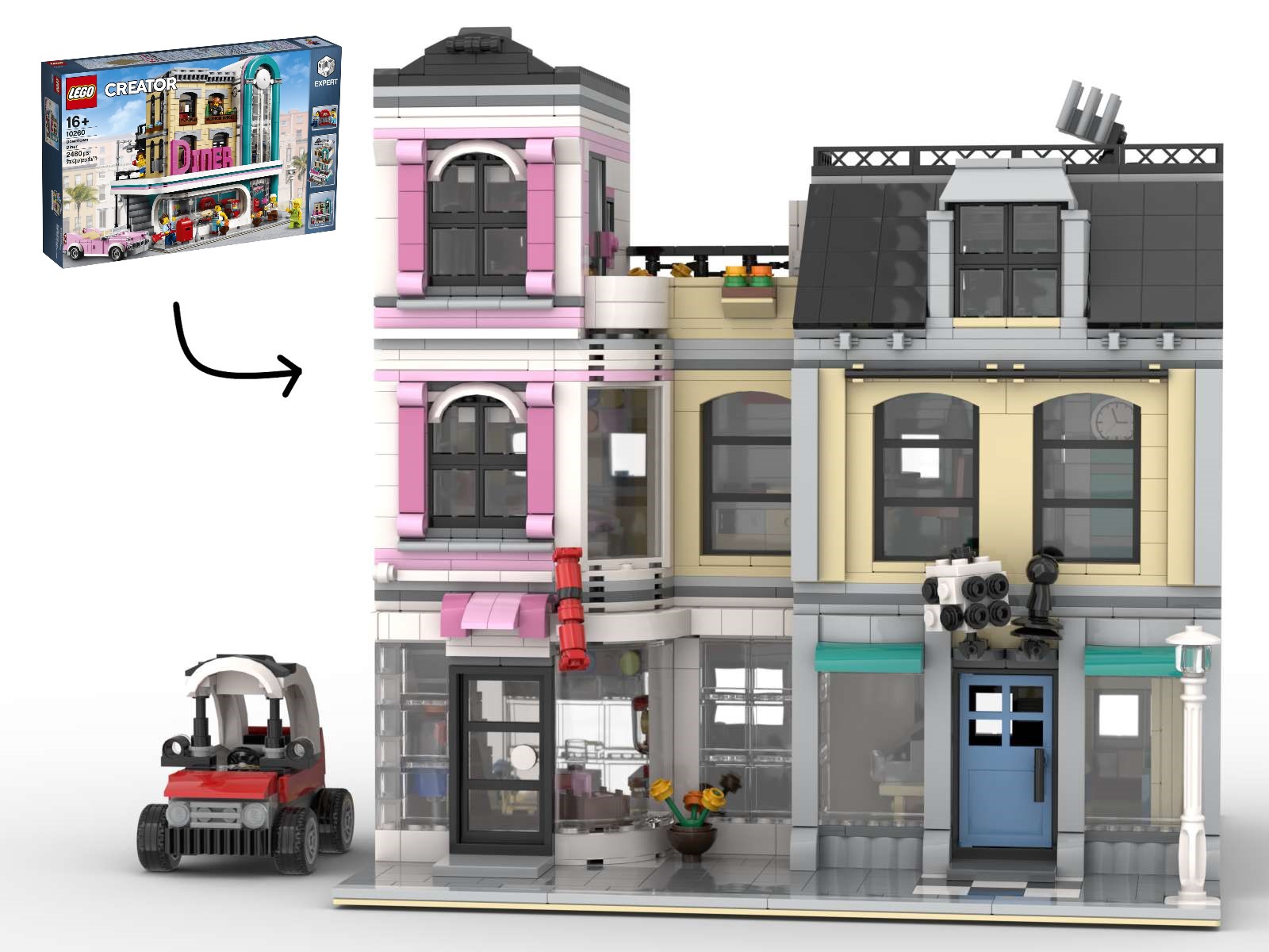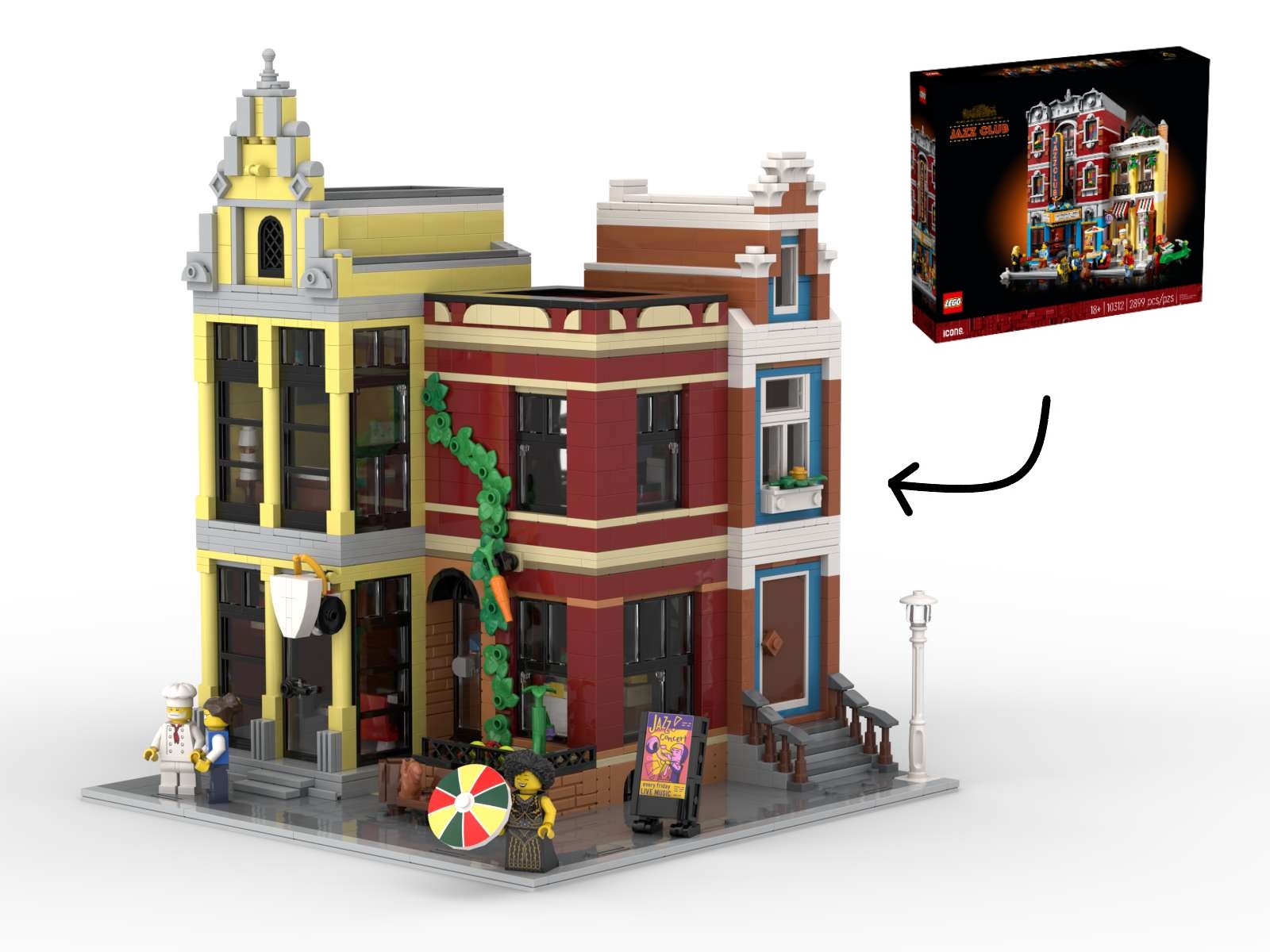 Dit gebouw is een ‘omgekeerde hoek’. Modulaire gebouwen van Lego hebben allemaal hetzelfde formaat: ze zijn gebouwd op een baseplate van 32×32 studs. Voor het gebouw is een stoep van 6-8 studs diep. Er zijn ‘rechte’ gebouwen en ‘hoekgebouwen’, die de hoek omgaan. Dit gebouw gaat ook de hoek om, maar naar je toe in plaats van van je af.